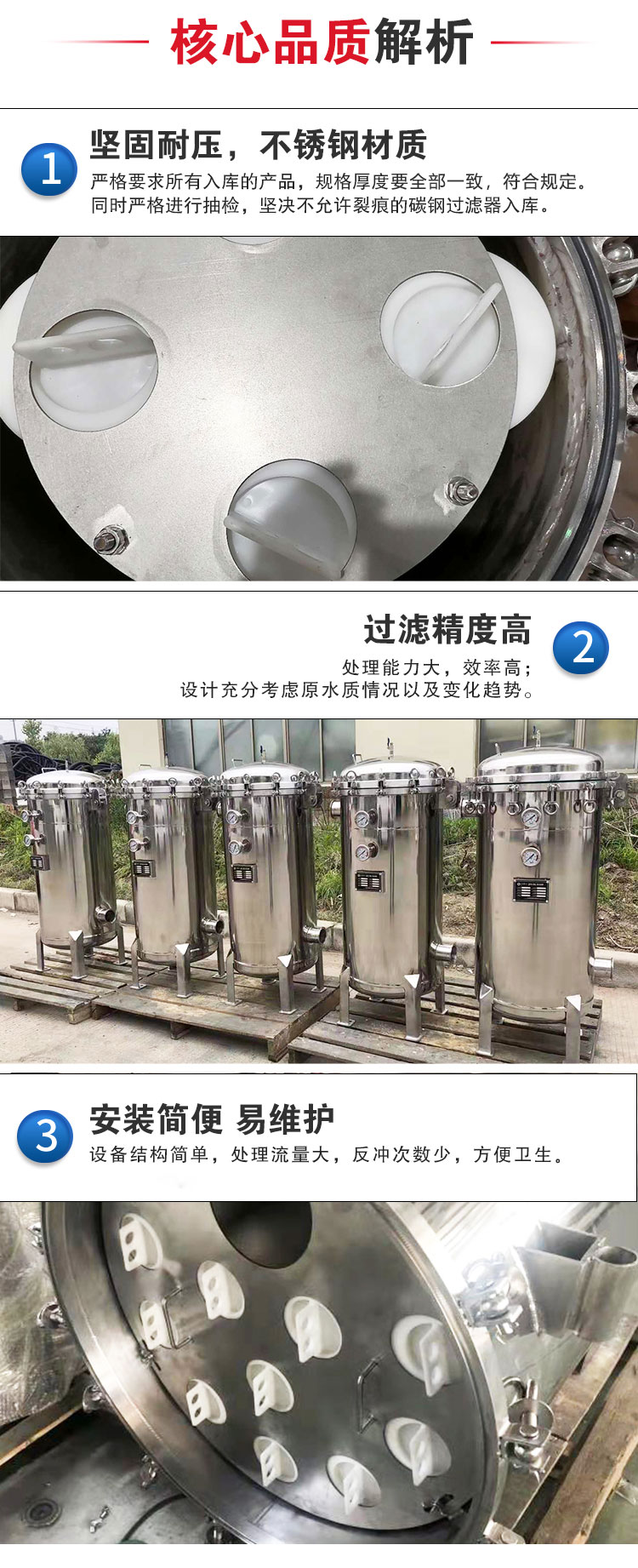 3芯40寸保安过滤器一般设置在压力容器之前,以除去油度1度以上的细小微粒,来满足后续工序对进水的要求;有时也设置在整个水处理系统的末端,防止细小微粒(如破碎的树脂)进入成品水。