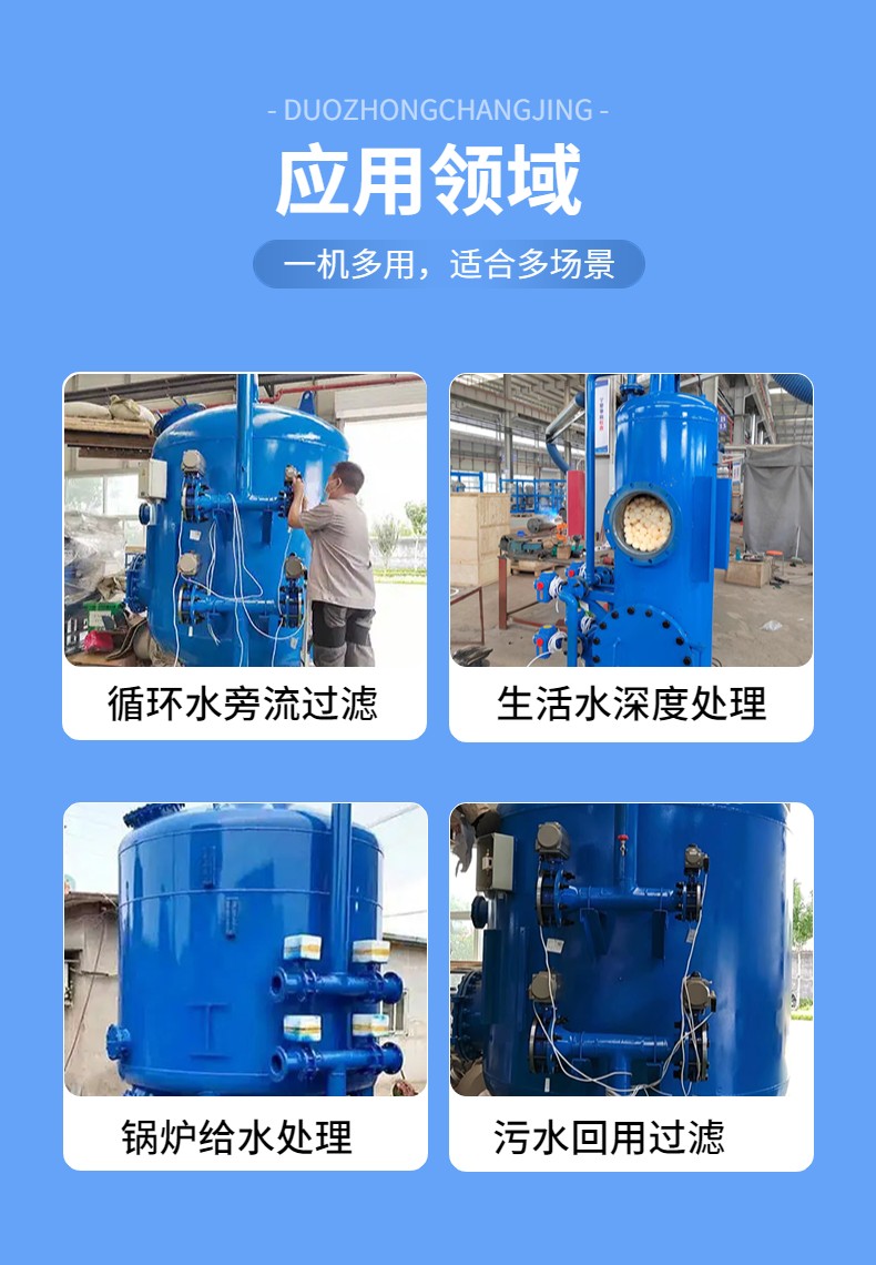 1、广泛应用于循环水旁流过滤、生活水处理、锅炉给水处理、反渗透前置过滤,污水回用过滤。
