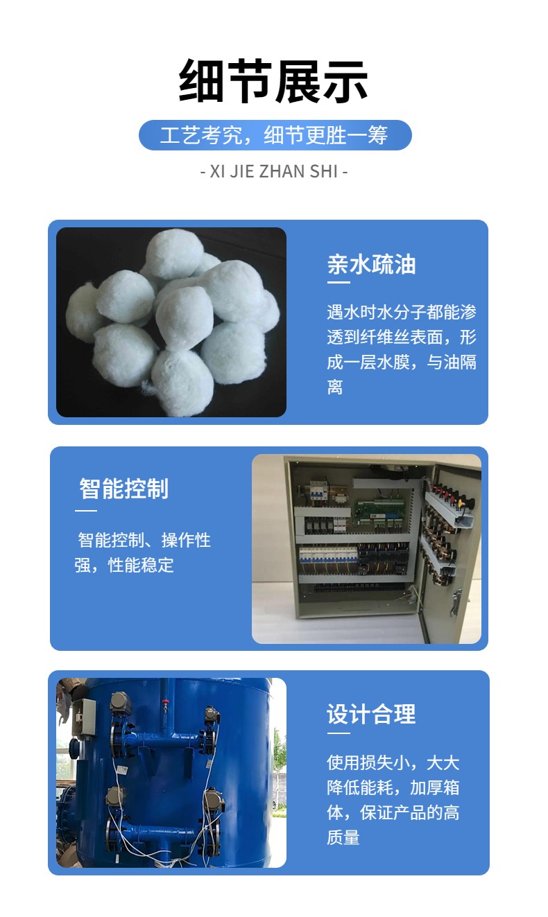 3、纤维球过滤机性价比高,占地面积小,自耗水量低,机械强度高,使用寿命长,操作简单,维护方便。